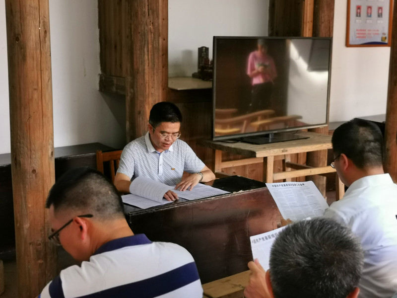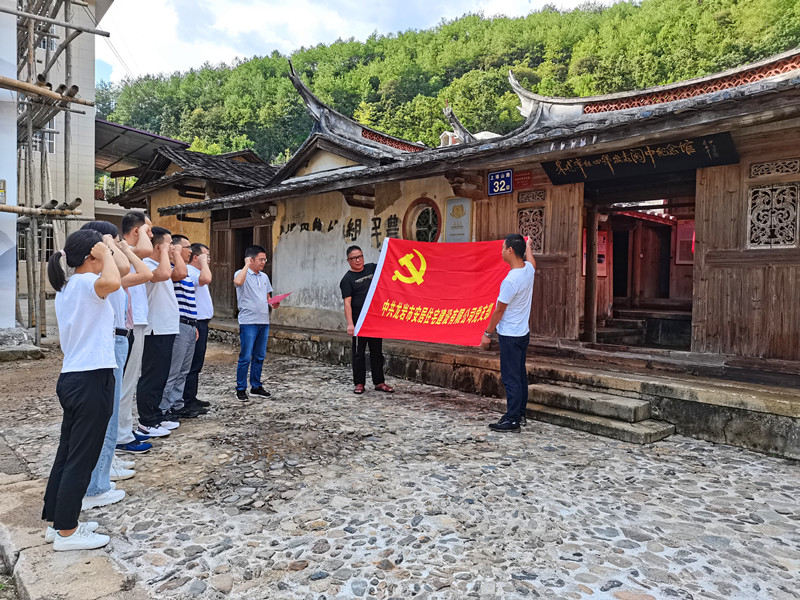全體黨員在漳平象湖紅色革命舊址群紅四軍出擊閩中紀(jì)念館(榮福堂)前,面對著鮮紅的黨旗,在支部副書記藍茂瑞同志的帶領(lǐng)下重溫入黨誓詞。