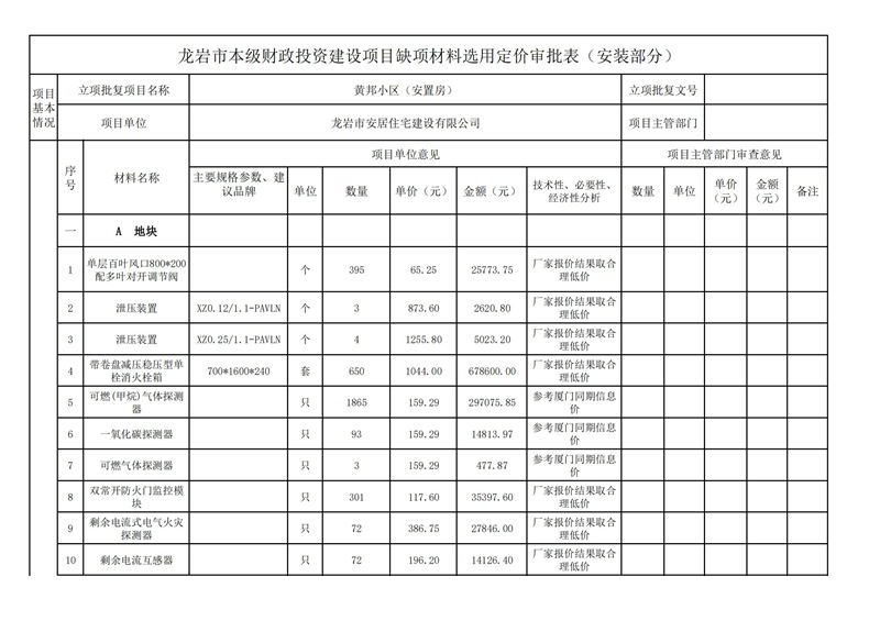 龍巖市本級(jí)財(cái)政投資建設(shè)項(xiàng)目缺項(xiàng)材料選用定價(jià)審批表 黃邦小區(qū)(安置房)安裝