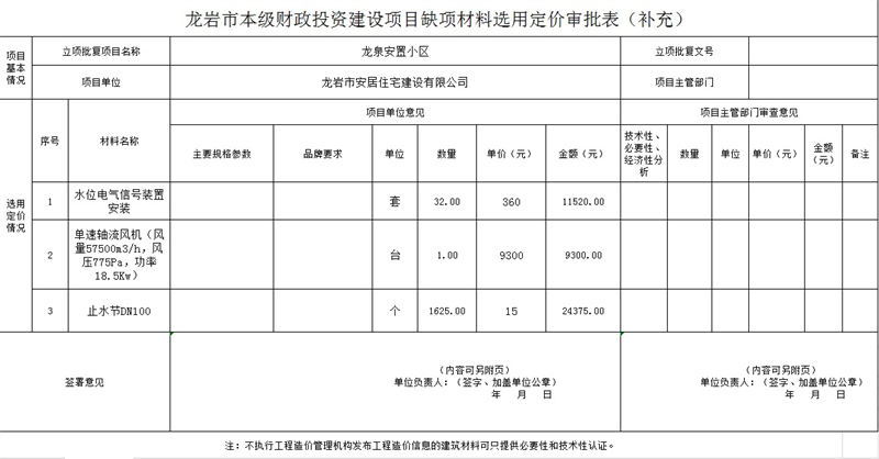 龍巖市本級財政投資建設項目缺項材料選用定價審批表(補充)
