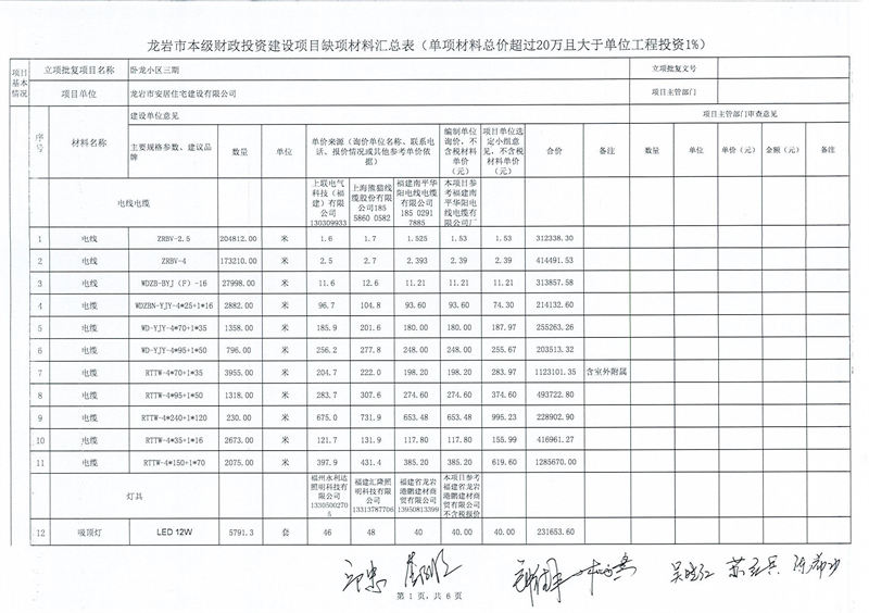 龍巖市本級(jí)財(cái)政投資建設(shè)項(xiàng)目缺項(xiàng)材料匯總表(單項(xiàng)材料總價(jià)超過20萬且大于單位工程投資1%)-臥龍小區(qū)三期