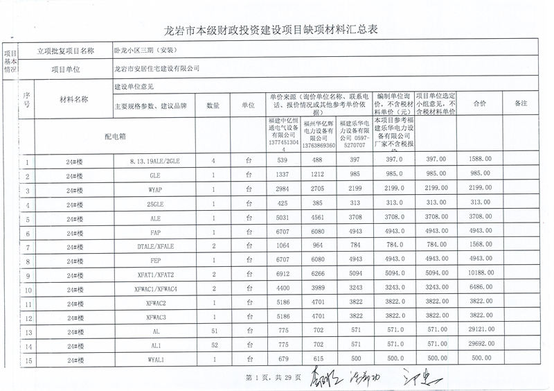 龍巖市本級(jí)財(cái)政投資建設(shè)項(xiàng)目缺項(xiàng)材料匯總表-臥龍小區(qū)三期(安裝)