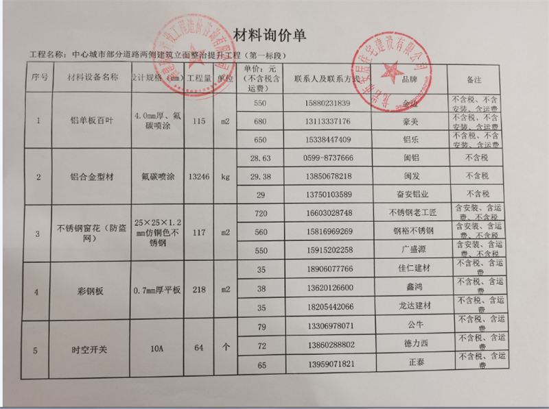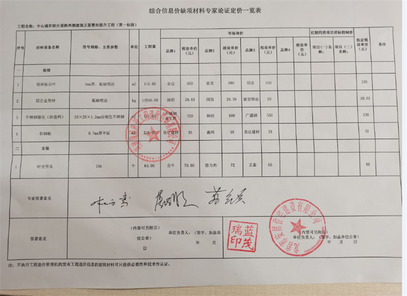 中心城市部分道路兩側(cè)建筑立面整治提升工程(第一標(biāo)段)缺項(xiàng)材料選用定價情況 補(bǔ)充公示
