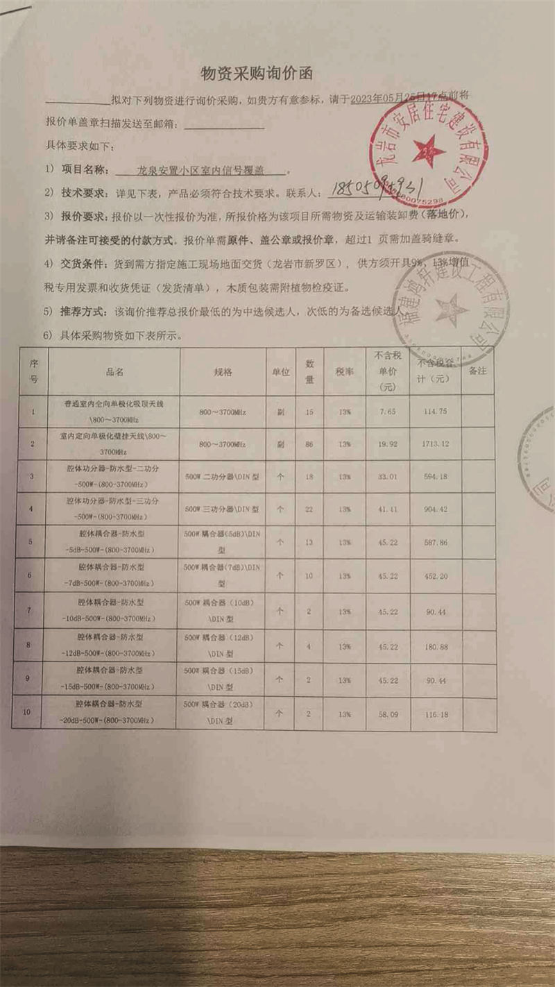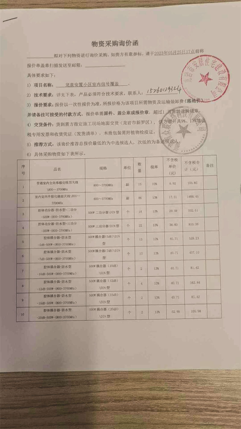 龍泉安置小區(qū)室內(nèi)信號(hào)覆蓋材料詢價(jià)公示